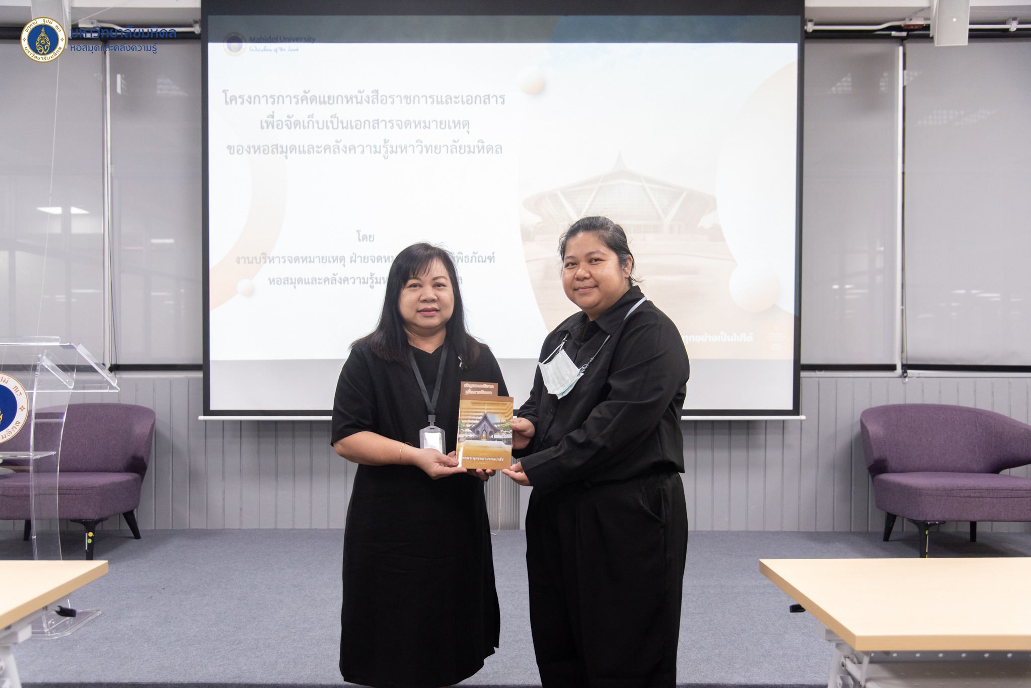 วันพฤหัสบดีที่ 18 ธันวาคม พ.ศ. 2568 ฝ่ายจดหมายเหตุและพิพิธภัณฑ์ฯ จัดโครงการคัดแยกหนังสือราชการและเอกสาร เพื่อจัดเก็บเป็นเอกสารจดหมายเหตุของหอสมุดและคลังความรู้มหาวิทยาลัยมหิดล ณ ห้องประชุม 1 ชั้น 3 อาคารหอสมุดและคลังความรู้มหาวิทยาลัยมหิดล โดยมีวัตถุประสงค์เพื่อส่งเสริมให้บุคลากรในหน่วยงานและฝ่ายต่าง ๆ ภายในหอสมุดและคลังความรู้ฯ มีความรู้ความเข้าใจในการคัดแยกหนังสือราชการและเอกสารที่ควรจัดเก็บเป็นเอกสารจดหมายเหตุในเบื้องต้น ตลอดจนสามารถจัดการเอกสารสำคัญได้อย่างเป็นระบบและเป็นระเบียบมากยิ่งขึ้น